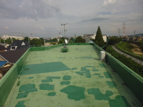 防水層の劣化が著しく、雨漏りがしていました。下地を傷めず、既設防水層の上に新たにリベットルーフ防水を施工しました