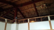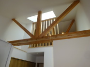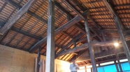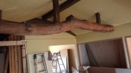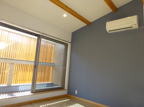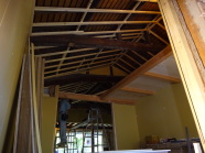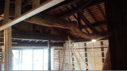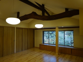 勾配天井として以前は隠れていた大きな丸太梁を見せています