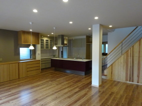 キッチン・リビング・寝室をワンフロア-にし、杖や車椅子に耐えれる床材にしました。トイレのドアは吊り戸にして、段差をなくし車椅子でもスムーズに入れるようにし、介助する奥様が動き易いスペースを確保しました。